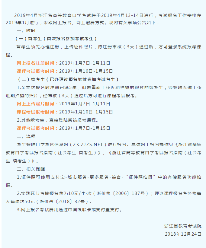 注:自考学员报考要求及考试安排详见浙江省2019年4月自考考试报考简章